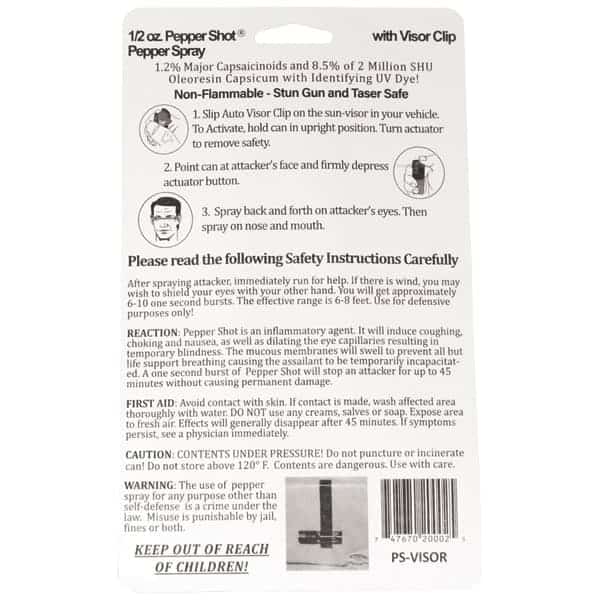Pepper Shot 1.2% MC 1⁄2 oz with automatic visor clip. Pepper Shot Pepper Spray is formulated with 1.2% Major Capsaicinoids. The Major Capsaicinoids represent the authentic heat measurement, and Pepper Shot 1.2% MC demonstrates superior efficacy compared to most other pepper sprays. Besides inflicting pain on an assailant, the Pepper Shot 8.5% oleoresin capsicum formulation engenders swelling of the mucous membranes, hinders respiration, and inflates the veins in the eyes, resulting in eyelid closure. It comprises 2,000,000 SHUs of raw pepper, with these effects potentially lasting up to 45 minutes without causing any permanent harm.