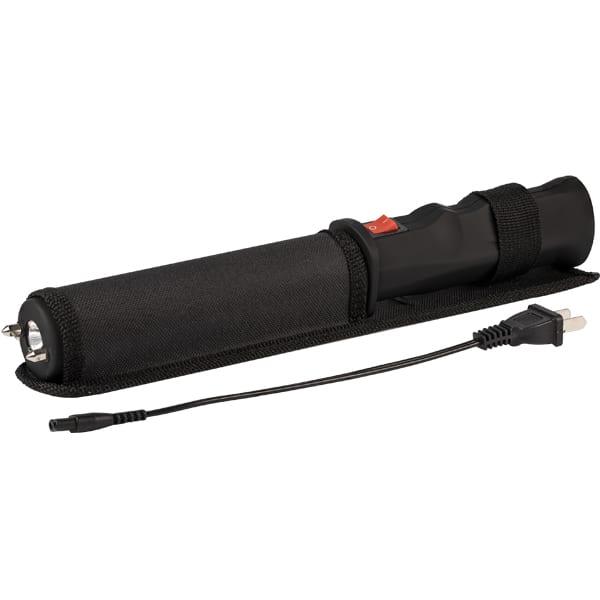 It measures 12 inches by 1.5 inches and comes with a wrist strap, disable pin, wall charger, and nylon holster.